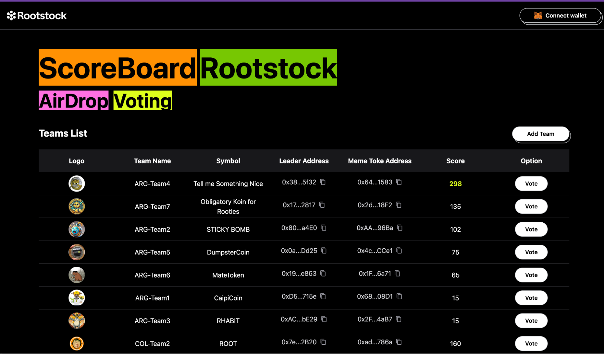 This project is a Governance Voting Dashboard built on the Rootstock blockchain. It allows users to create and vote for teams using governance tokens ERC20 tokens.